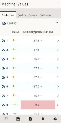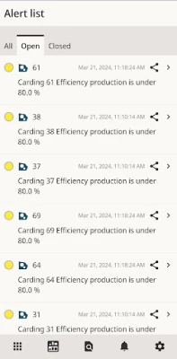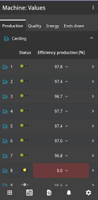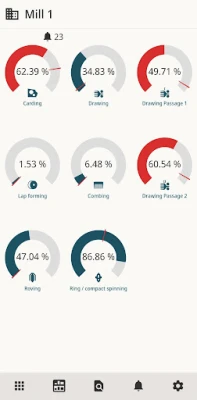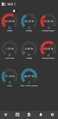 The App is part of the Mill Control System ESSENTIAL by Rieter Machine Works. The App includes the Cockpit and the Alert Module. The Cockpit Module displays the most important production data of a spinning mill including shift reports. The Alert Module highlights the cases where the mill does not perform. It supports to find the reason why.