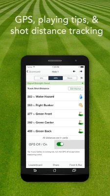 - Interactive Scorecard - Golf Games: Skins, Stableford, Par, Stroke Scoring - GPS - Measure your shot! - Golfer Profile with Automatic Stats Tracker - Hole Descriptions & Playing Tips - Live Tournaments & Leaderboards - Book Tee Times - Course Tour - Food & Beverage Menu - Facebook Sharing - And much more…