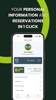 Simply log in to your account from the app, access your customer benefits, and be rewarded for your loyalty! With B&me, you can enjoy a generous and free breakfast on your second stay, a night for €50 in all our latest hotels, or a free Sunday check-out until 2 PM! With your B&B Clubs program, you can accumulate points and exchange them for vouchers offering free breakfasts and nights*. Easily keep track of your different reservations and personal information all in one place.